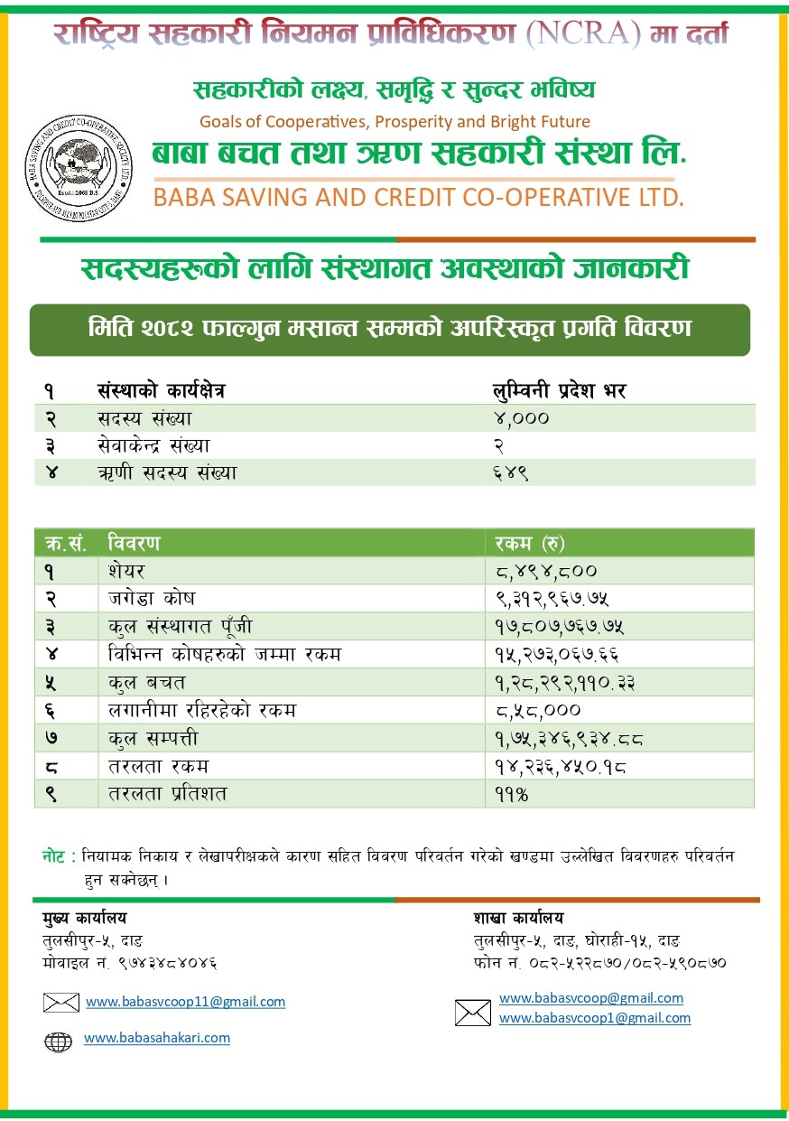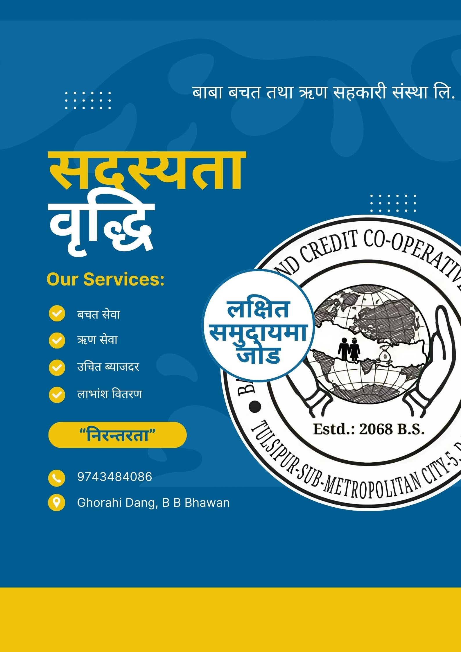 Nepali society remained confined under an autocratic and unitary system of governance for a long time. After 103 years of Rana regime, the country entered a 30-year Panchayat rule, which, although slightly more flexible, brought little significant change in terms of economic, social, and cultural development. The entire economy remained concentrated in the hands of a few landlords and merchants in villages and towns. "Baba Savings and Credit Cooperative Ltd." was established through the initiative of Mr. Nirmal K...